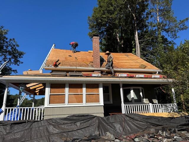 In Hartford, we worked on a beautiful historic home with a century-old slate roof that had seen better days. The original slate was removed carefully, revealing sections of plywood that needed replacing. After swapping out the damaged wood, we laid down our trusted SealoronXT Ice & Water Shield and VeloraONE Underlayment to keep the roof watertight. To finish, we installed Frosttone Grey shingles that not only enhance the home’s classic look but also provide durable, long-lasting protection for years to come.