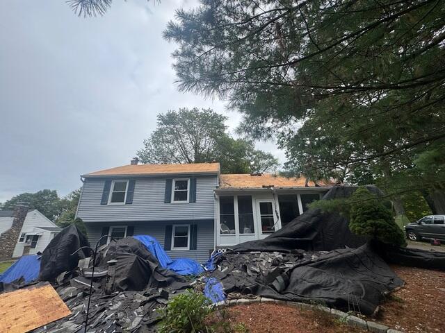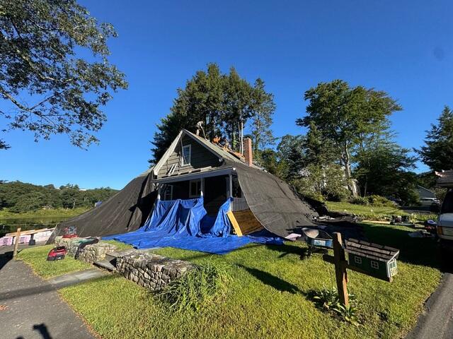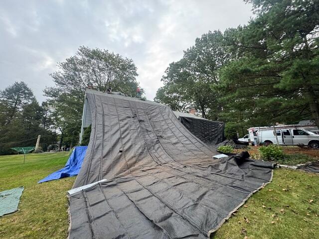 This photo from a roof replacement in Oxford, MA shows part of our prep process in action. Before we start removing old shingles, we lay out large protective tarps to cover the siding, lawn, and landscaping around the home. As the crew strips the roof, the shingles slide down the tarp and collect in a central area. From there, we use wheelbarrows to move the debris directly to the dumpster. This method keeps the job site cleaner, speeds up cleanup, and most importantly, helps prevent any damage to your property. Just another way we make sure the roofing process is smooth and stress-free for homeowners. The Klaus Roofing Way!