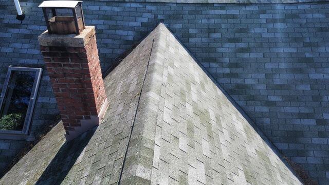 Minor repairs on a roof can you save you money short term, but a problem spot will inevitably turn into a wider problem area. We started this roof up from scratch. Both chimneys were reflashed, the bathroom exhaust vent was reconnected to an existing flex duct, and we installed a new exterior exhaust hood for the kitchen fan. We also replaced and reflashed all skylights and installed new interior finish trim for them.