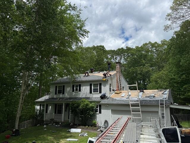This home in Lebanon, Connecticut was in need of a new roof and Klaus Larsen Roofing gave them just that! To begin this job, we removed the existing layer of roofing material. Afterwards we cleared away all debris and used a magnetic roller to ensure that there were no loose nails in the homeowner's lawn. Next we inspected the plywood decking, and found that 2 sheets of plywood were visibly damaged and in need of a replacement. With the decking process finished, we installed two rows of IKO Gold Shield Ice & Water Barrier. At the seams we installed a 4" self-adhering flashing tape and installed a synthetic underlayment to ensure protection from the elements. For shingles, we installed a Klaus Roofing System using IKO Dynasty Architectural Shingles in the Driftshake colorway. To finish the job, we installed a Shingle Vent II ridge vent that ensures the home's attic is well ventilated. This home is now complete thanks to Klaus Larsen Roofing!
