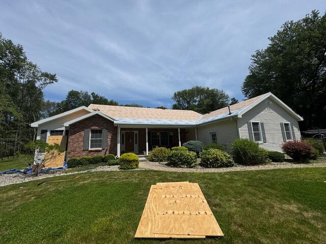 The owners of this ranch in Groton had a major leak that was right above the kitchen cabinets. So every time they had a heavy rain, the dishes would get a surprise washing. When they got a door hanger from us promoting our winter roofing, they immediately got a quote from us and scheduled the work for later that month. Suddenly a major rainstorm was on its way and the owners were worried that if they did not get the roof fixed soon they would have a mess on their hands. So they called and, because it was an emergency job, we were able to move up the work and got it done before the storm came. Our crew came and tore off the old shingles and replaced the rotten sheets of plywood. They then installed nine feet of Ice and Water barrier and installed Synthetic Underlayment. The entire installation, start to finish, was done in one day and the crew cleaned up the yard thoroughly. When the rainstorm finally came and poured down on their home, the owners opened up their cabinets to check on the leak and it was all dry.