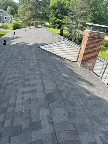 The owners, who live in Lebanon, were looking to replace their roof when then called us to give them a free estimate. While the roof was being replaced, we also replaced the ridge vent on the peak of the main house. The chimney flashing and vent boots were also replaced because these are easy water penetration areas if not properly flashed. Lastly, Premium Ice & Water shield was installed on the shed dormer roof due to its flatness. Low pitch roofs shed water and ice more slowly and require extra protection to prevent leaks down the road.