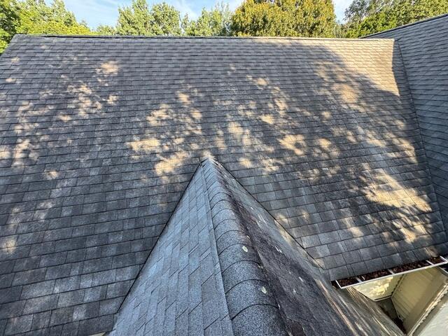 We met this nice couple on a beautiful weekday morning. Besides the roof being old and not looking great, the quality was shoddy, and it also had algae on it. Algae causes moisture buildup, condensation around the nails, and small leaks. The cap shingles were also backward and nailed down through the shingle face. Usually, we would overlap other shingles on top of these nails because exposed nails generally lead to leaks.