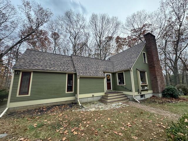 On this ranch in Lebanon, CT we provided another Roofing System, with its 50 year full Coverage Warranty. On this job we did a good amount of structural repair, including removing and replacing the fascia/rake boards with Kleer composite trim boards. In addition, we removed a kitchen vent as well as a small, secondary chimney. The main chimney was redone with leak proof flashing. The resulting roof is practical, efficient and far less cluttered.