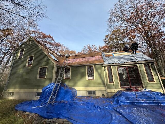 Elizabeth, who lives in Groton, CT, owns this beautiful home featuring a flat roof section that is now 25 years old. Recognizing the need for an upgrade, she reached out to us at Klaus Larsen Roofing for a quote on a roof replacement and new gutters. Our team quickly got to work, assessing the existing flat roof and determining the best approach for replacement. We understand that a flat roof can present unique challenges, especially regarding drainage and durability. With Elizabeth's vision in mind, we planned the project to ensure not only a functional roof but also one that will improve the look of her home. As we moved forward with the replacement, our team was committed to using high-quality materials and expert techniques, ensuring that Elizabeth's home would be protected for many years to come. Removing all old decking, we replaced this plywood and applied the flat roof protections. Elizabeth also got siding, gutters, and attic insulation. Call us today to improve your home just like Elizabeth did. The Klaus Roofing Way!