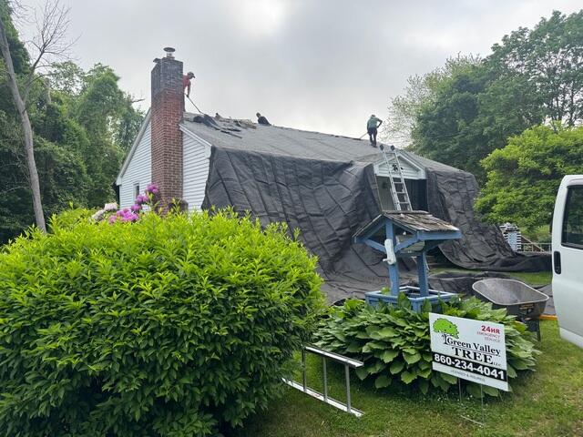 This home in Ellington had a roof that was leaking near the back of the house. We were able to send one of our consultants out to inspect the roof right away and present a solution. Since the leak was isolated to the back area of the house, we recommended having the back half of the roof replaced all the way from the gutters to the ridge. Before the job started, we brought tarps a few days earlier to cover the leaking roof to prevent the damage from getting worse. On the day of the job, our crew tore off the old shingles and replaced 25 sheets of plywood with new 1/2” CDX plywood. On the same afternoon, the crew installed 9 feet of Ice & Water barrier and Synthetic underlayment. Then, they installed the new Shingles and cleaned up the property. The repair was done quickly and effectively prevented the water from leaking into the house.